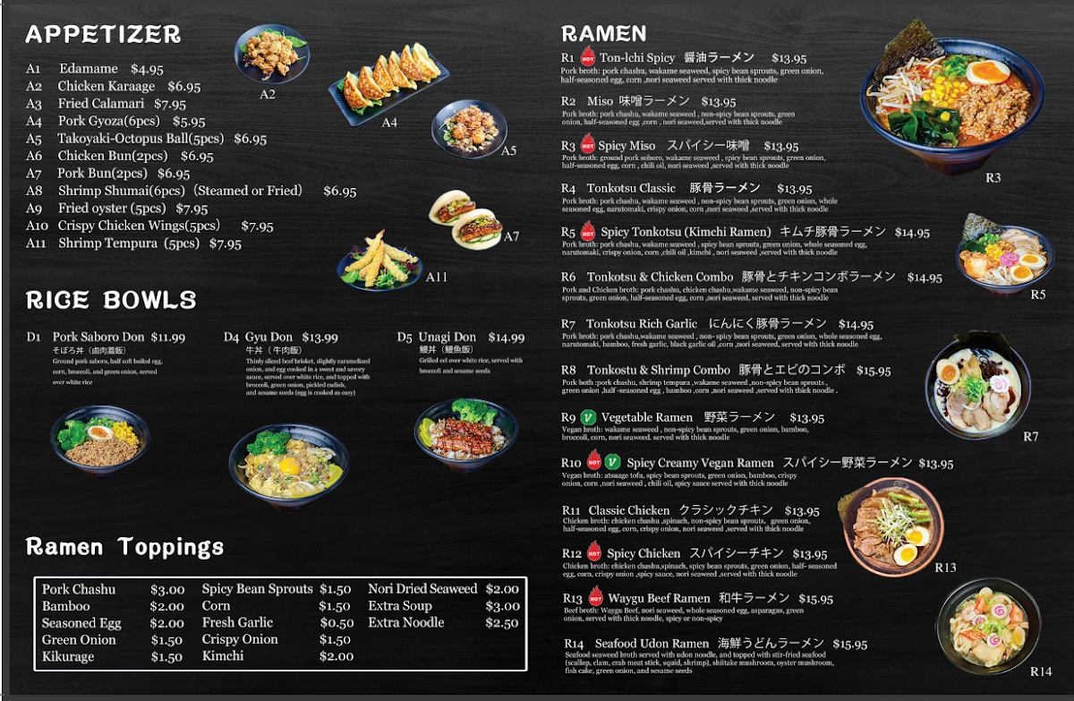 Pork broth: pork chashu, wakame seaweed, non- spicy bean sprouts, green onion, whole seasoned egg, narutomaki, bamboo, fresh garlic, black garlic oil, corn, nori seaweed. Served with thick noodle.