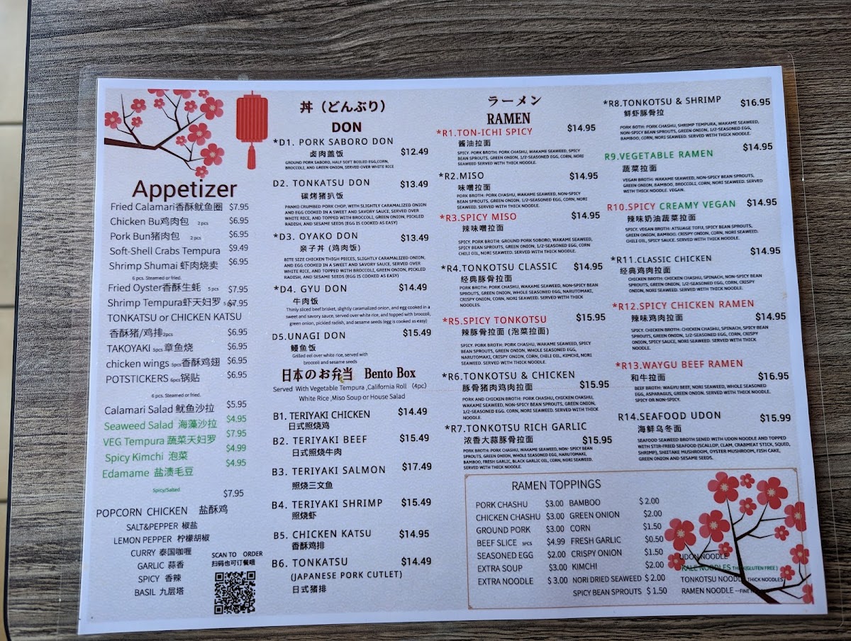 Spicy. Chicken broth: chicken chashu, spinach, spicy bean sprouts, green onion, 1/2-seasoned egg, corn, crispy onion, spicy sauce, nori seaweed. Served with thick noodle.