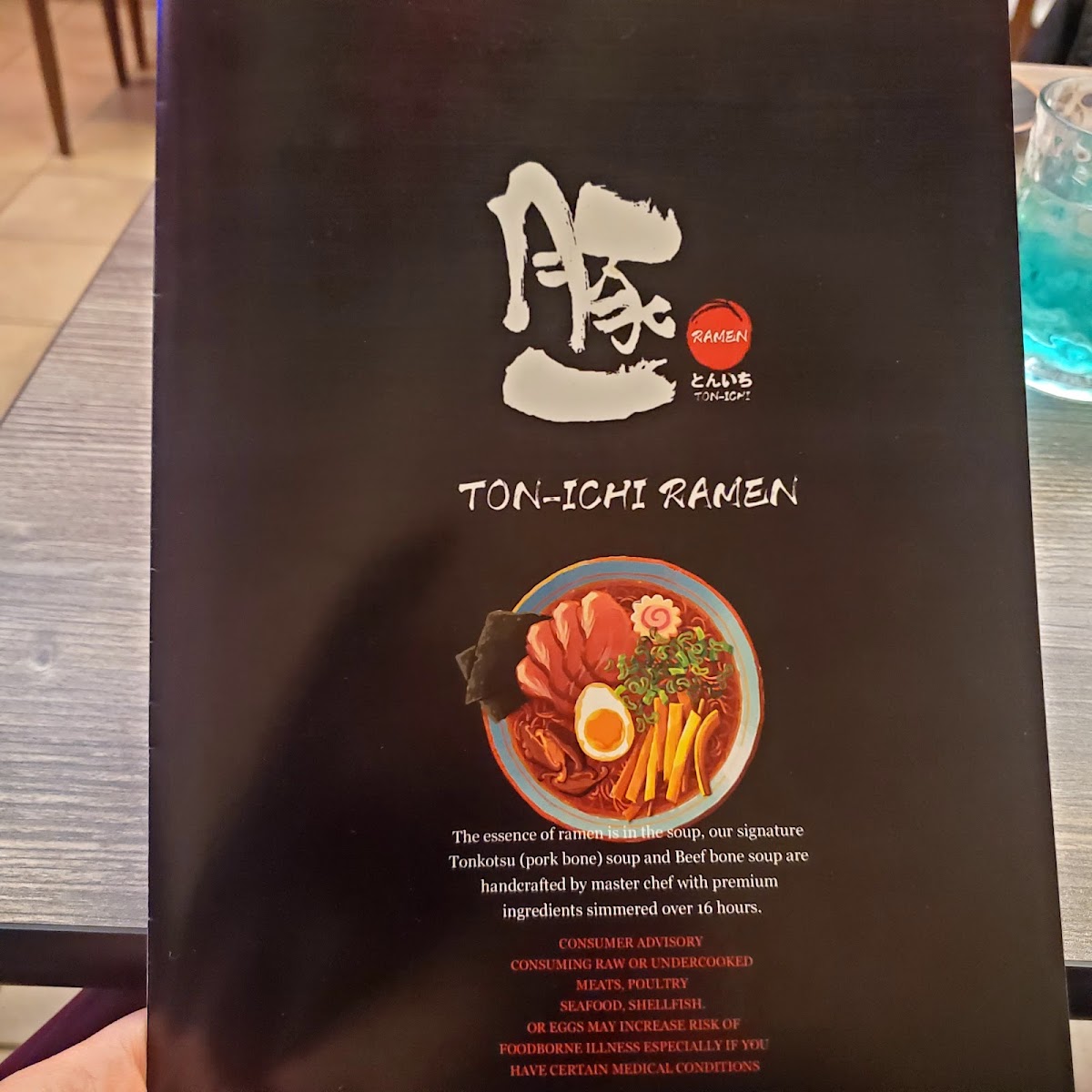 Chicken broth: chicken chashu, spinach, non-spicy bean sprouts, green onion, 1/2-seasoned egg, corn, crispy onion, nori seaweed. Served with thick noodle.